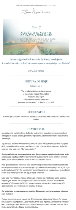 Como funciona: ao longo desses trinta dias, você dedicará um tempo para mergulhar na Palavra de Deus. Você se concentrará em quatro passagens bíblicas principais, todas com algo a dizer sobre o Bom Pastor e as ovelhas que às vezes correm em direção ao perigo espiritual. Você não encontrará respostas fáceis ou soluções rápidas. Você será lembrada de que Deus está disposto e é capaz de realizar uma obra miraculosa no coração do seu amado ou amada. Pelo caminho você também encontrará “Gotas de Graça”. Elas servem para te dar uma dose extra de reflexão e de oração por seu pródigo.